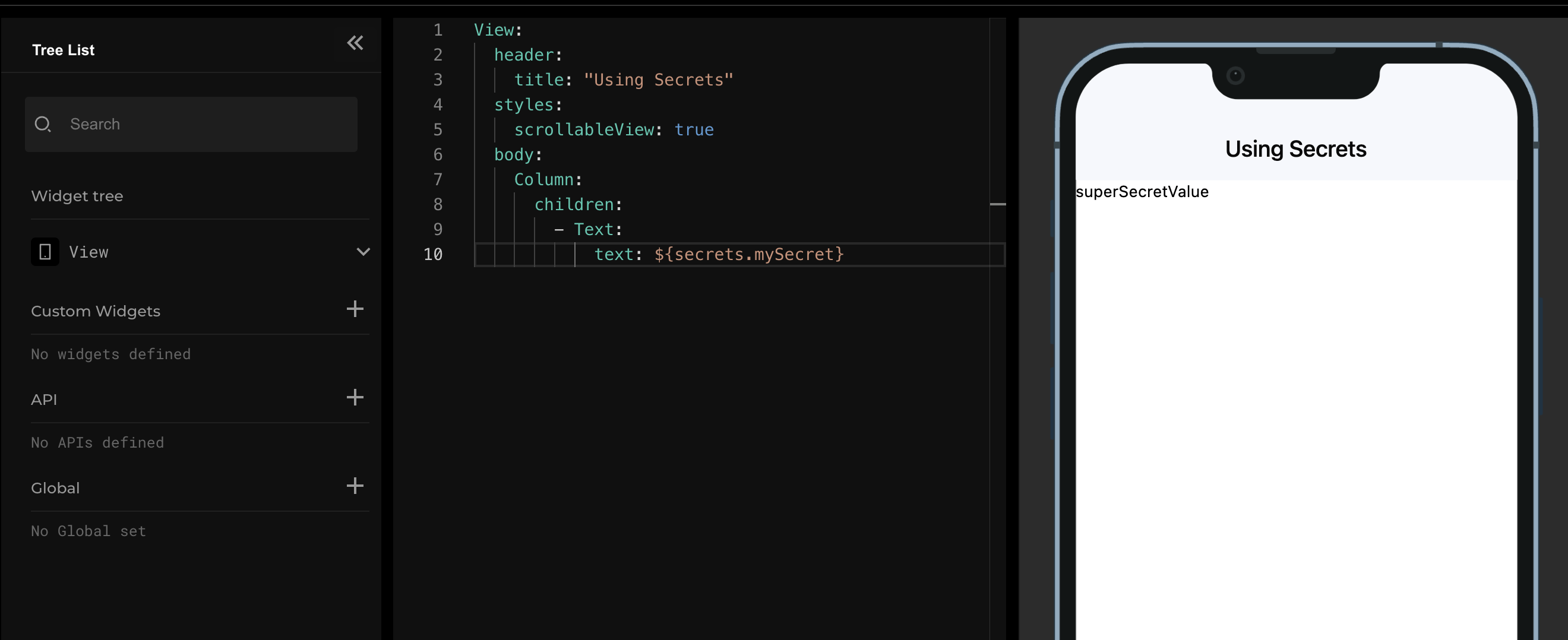 Any screens can reference the variable with ${secrets.key_name}. Here we are simply displaying the secret value in a text field.